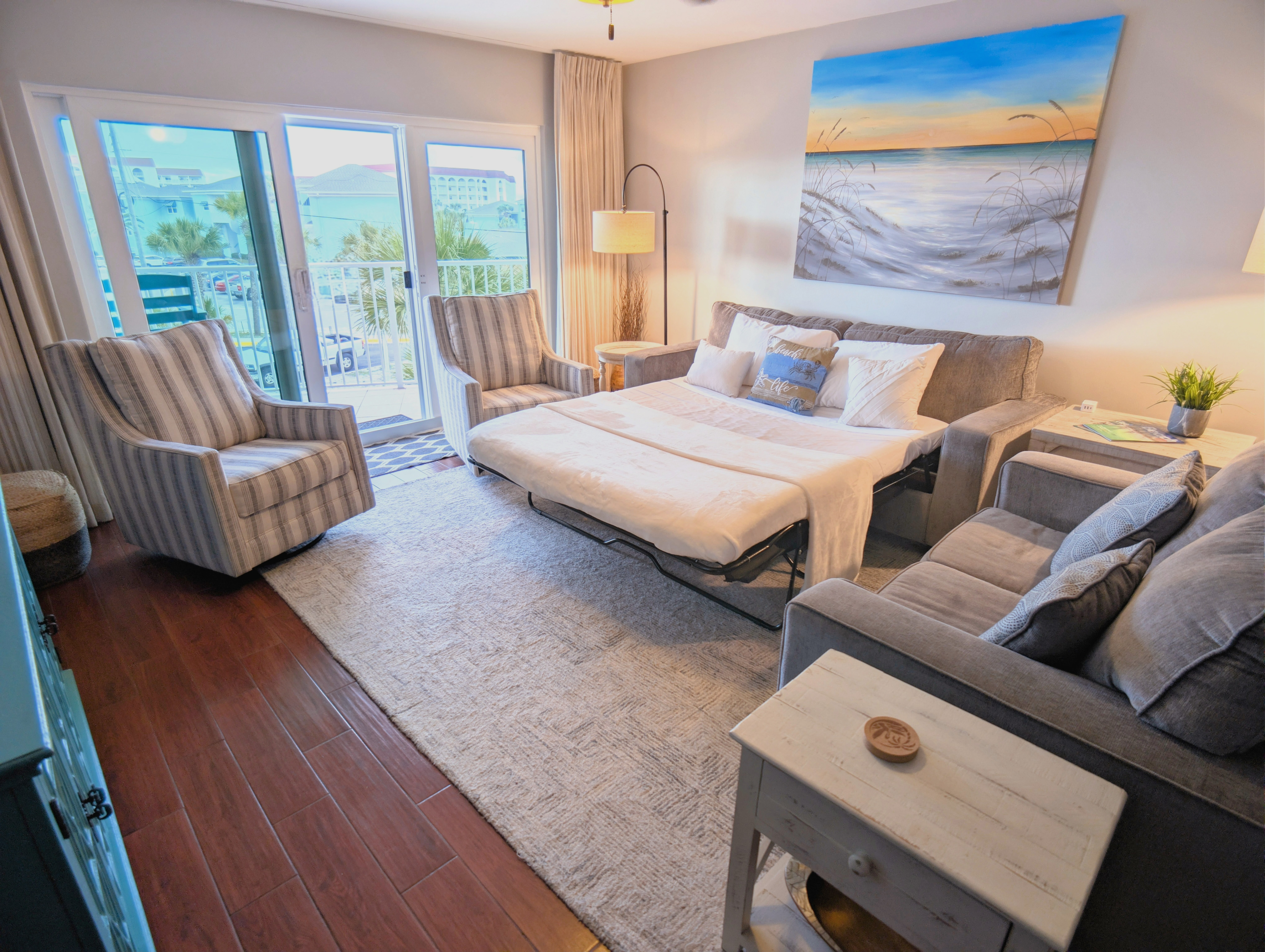 Enjoy easy walking access to the sugar-white beaches just steps away, ideal for swimming, sunbathing, and sunset strolls. Nearby attractions include the Gulfarium Marine Adventure Park, Okaloosa Island Fishing Pier, mini golf, casual dining, and family-friendly activities throughout Okaloosa Island, all without needing to drive.