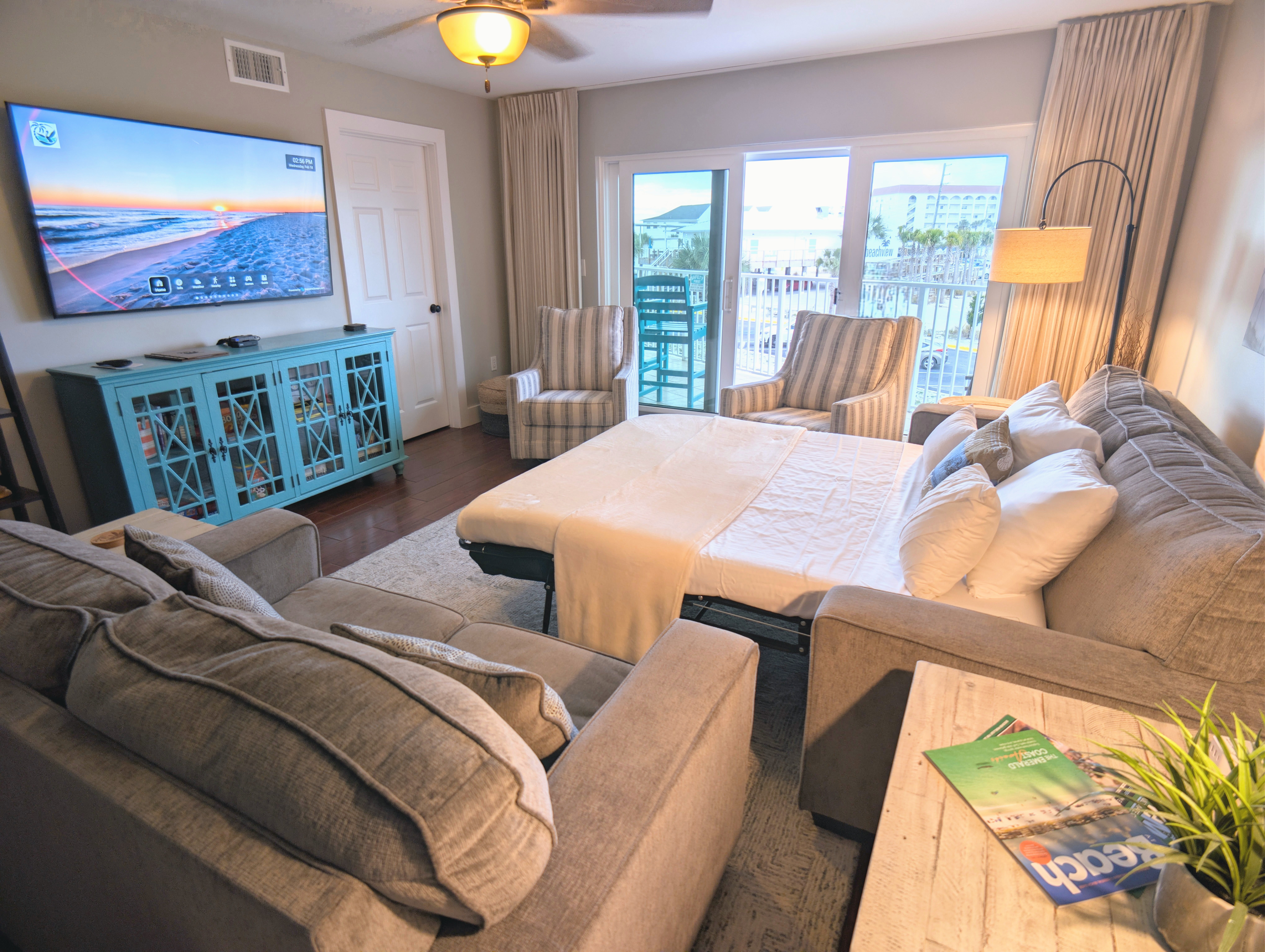 Wake up to ocean views in this upscale boutique coastal retreat. Nearly 1,200 sq ft of comfort, style, and space - perfect for couples or families. Bedrooms feature king beds and sitting chairs, plus a sleeper sofa in the family room. Enjoy a fully stocked kitchen with coffee bar, stainless appliances, and dining for six. Smart TVs throughout, books, games, DVDs, and a retro Atari. Relax on the ocean-view balcony, swim in the quiet indoor/outdoor pool, grill, and walk straight to the beach.